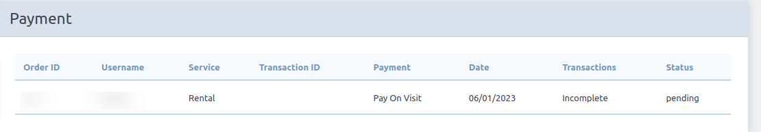 Payment Once an end-user has placed an order using any payment method such as pay at visit, stripe, or paypal. This section section contains a list of all such orders Doc navigation← RentalSettings → How can we help? Name Email Subject Message