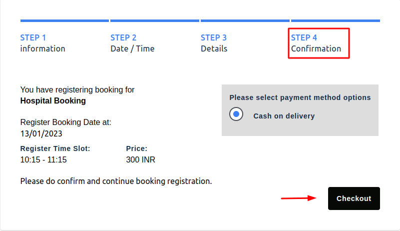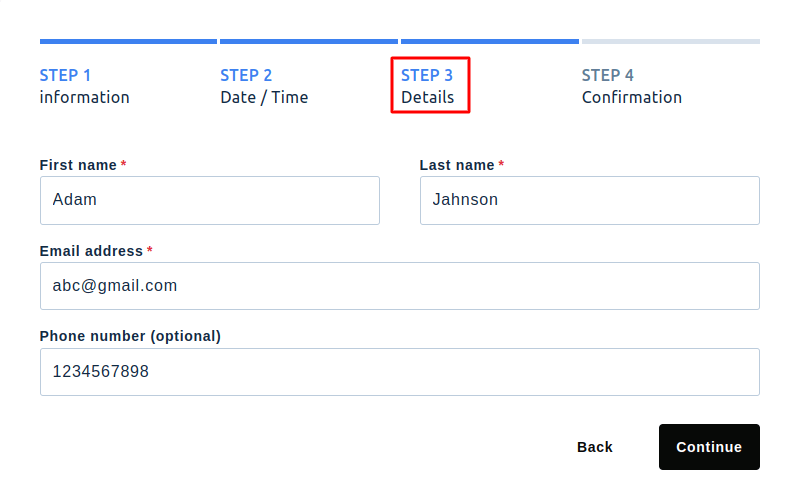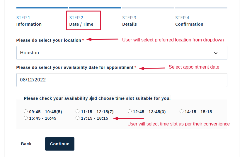 - The user will fill out all the information, including the location, date, and time slot, in step 2 according to their preferences.