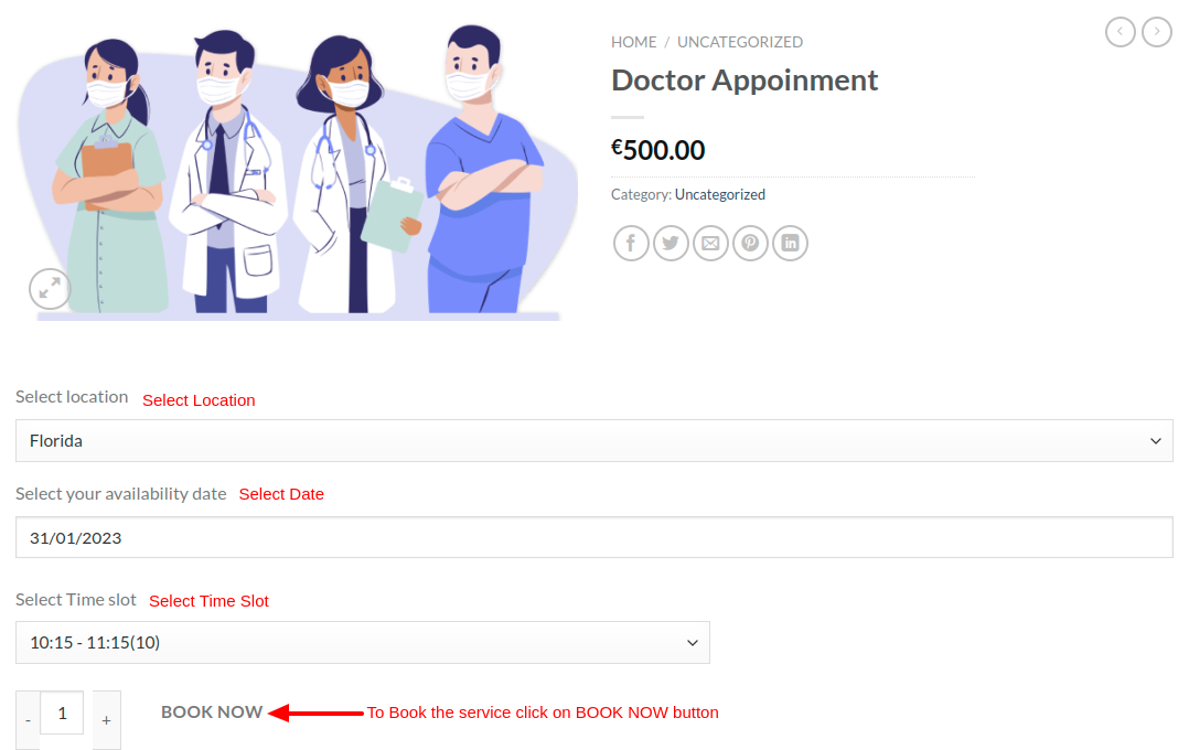 Following the selection of a product or service that can be booked from your Dokan store, the customer must complete the following actions.