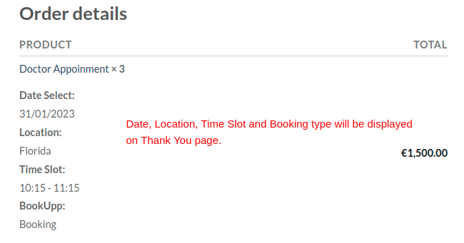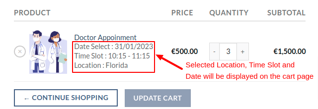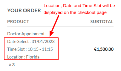 After clicking on the Book Now button the product will add to the the cart. The Selected Location, Selected Date and Selected Time slot will be displayed on the Cart, Checkout, and on the Thank you page.
