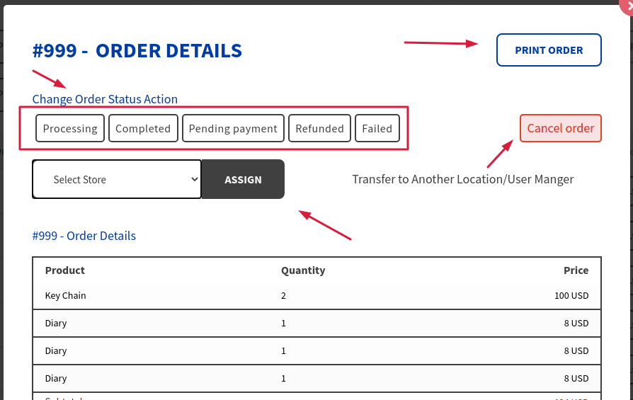 • Assing:  You can assign specific order to Another location.  Just select the desired location through the dropdown and click on “Assign”.  The order will be transferred to that location shop manager and the order is removed from the current location shop manager.