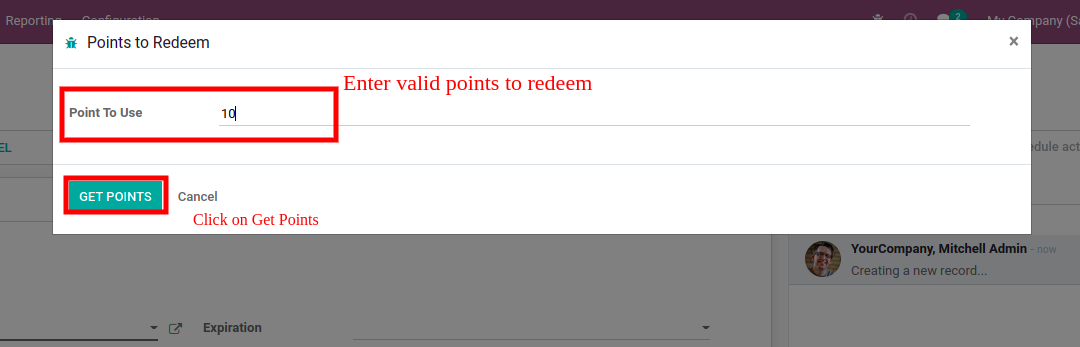 7. A new pop-up window of Points to redeem will open->Enter valid points to redeem->Click on Get Points