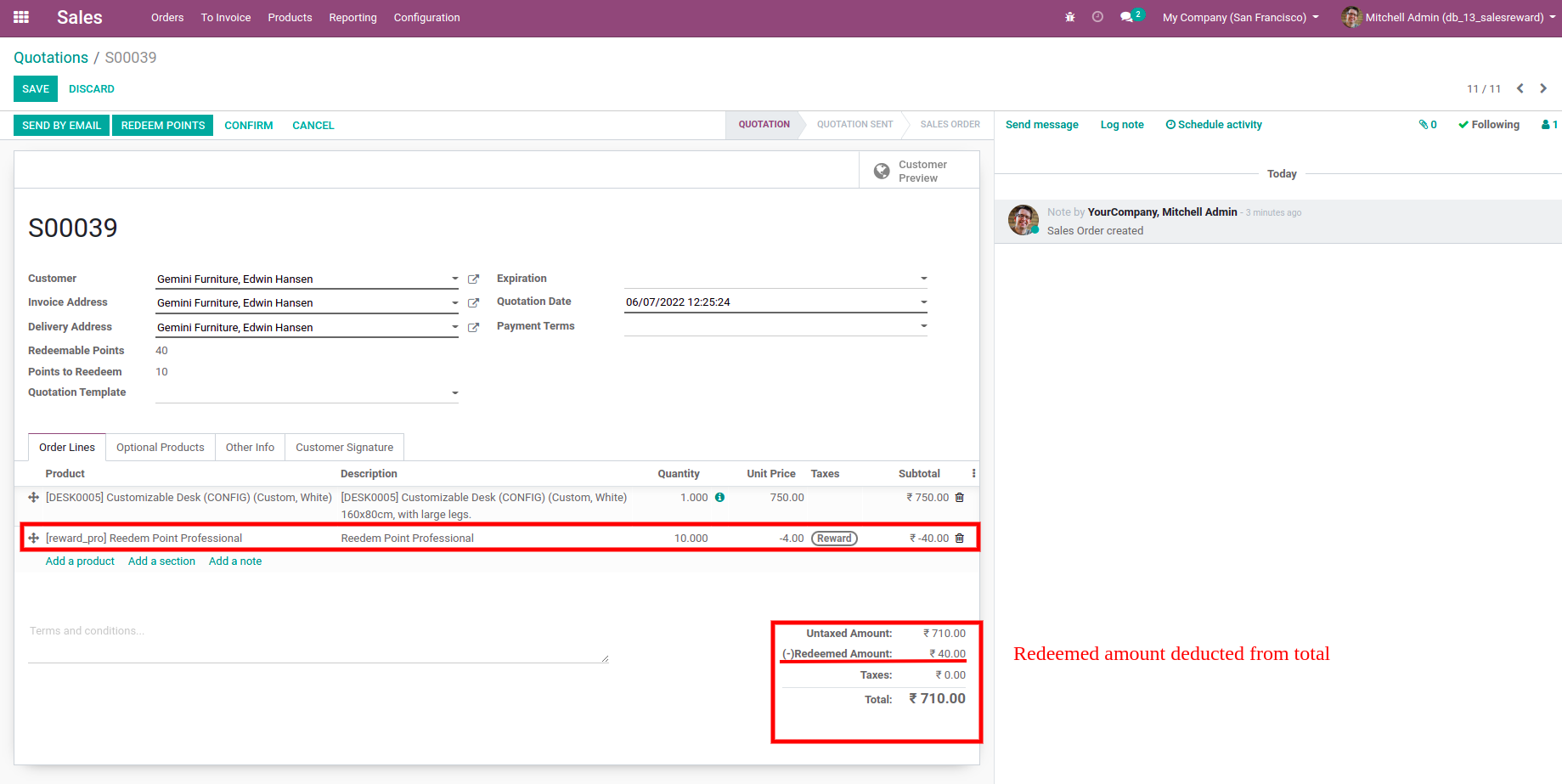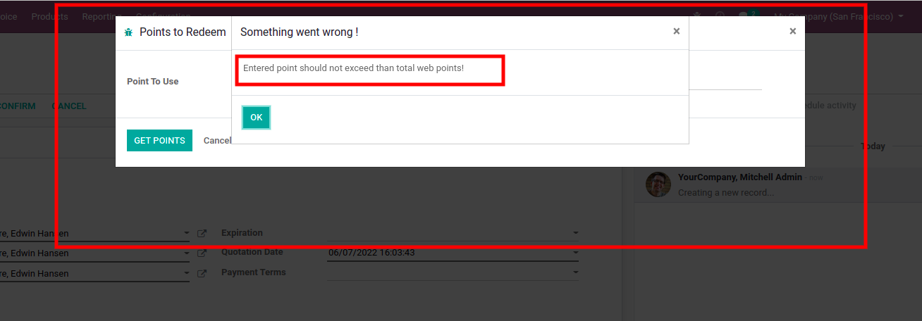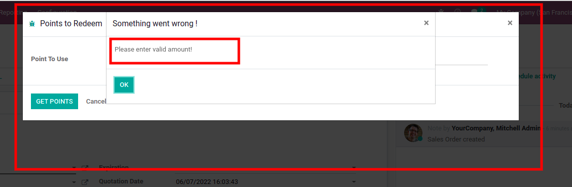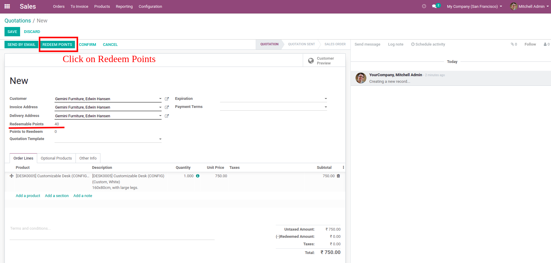 6. Redemption of points from sale order: – Goto Sales ->Click on Create Quotation ->Add customer & product ->Click on Redeem points->A pop-up window of Points to redeem will open