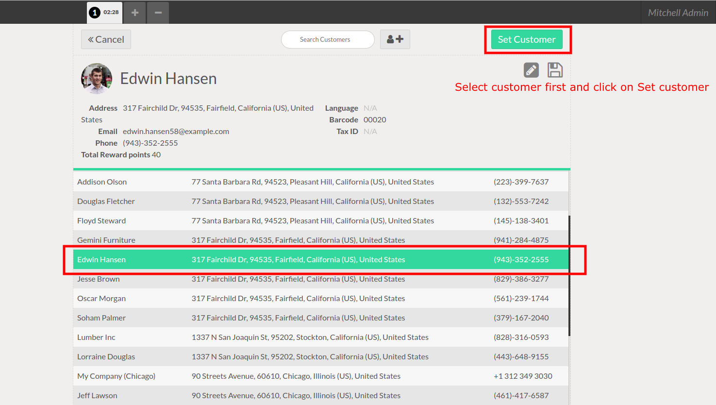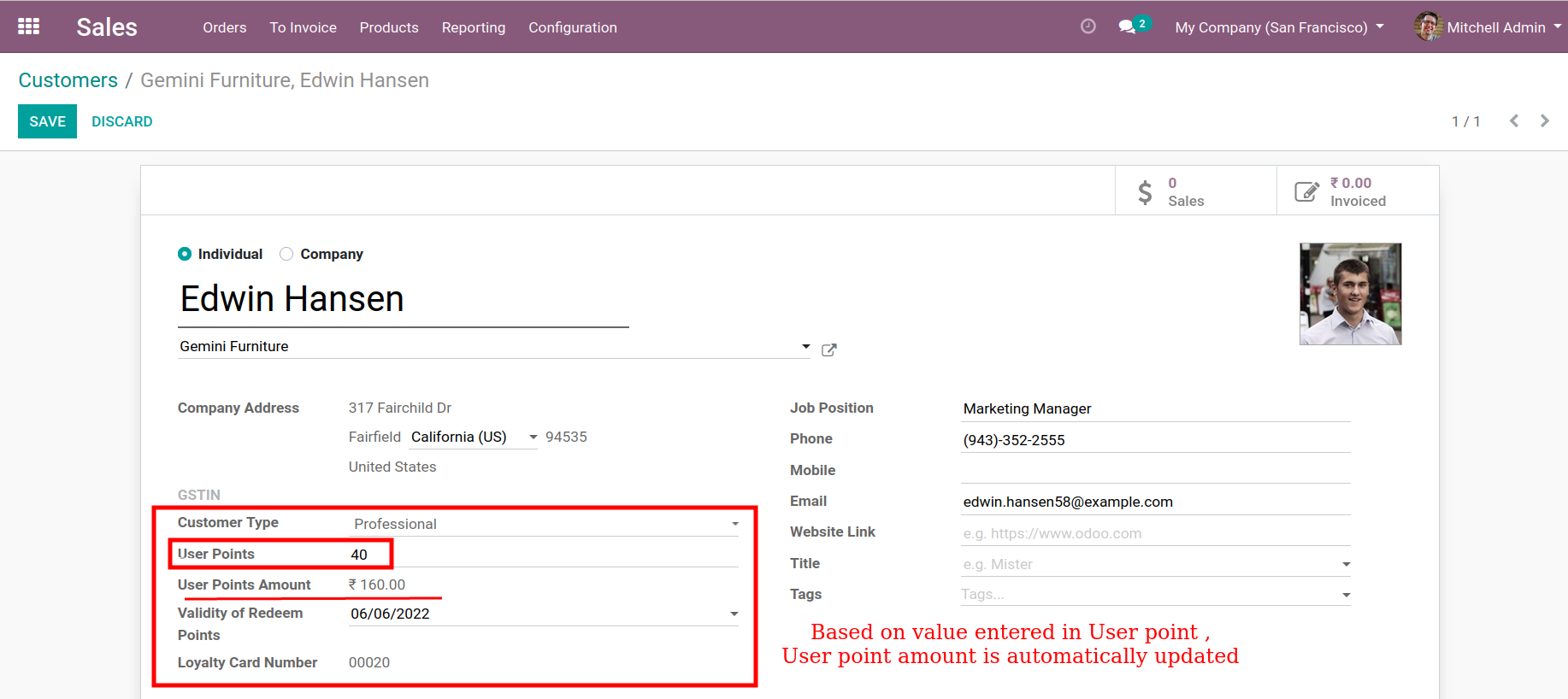 2. Automatically calculates the redeem amount when points are added— Refresh -> Go to ->Sales Module ->Order Menu ->Customer sub menu ->Click on a contact->Edit & enter user points (based on user points entered, User Point amount will be updated).