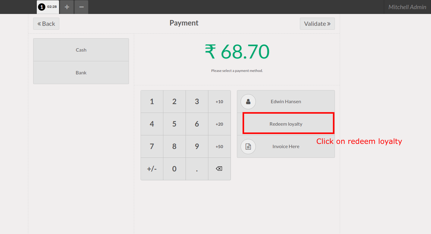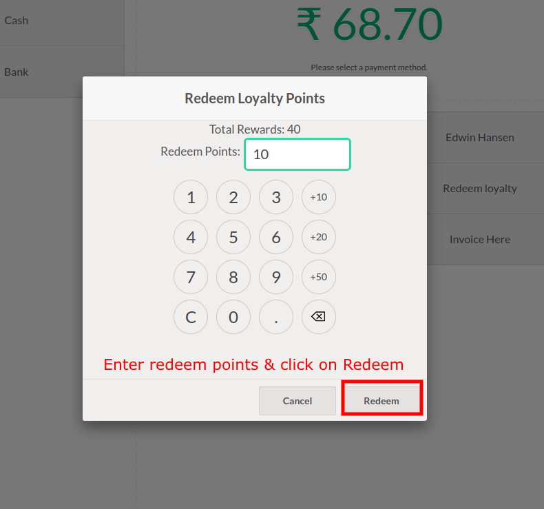Redeem Loyalty:- Once this button is clicked selected points will be redeemed and encashed and deducted from total amount of purchase.