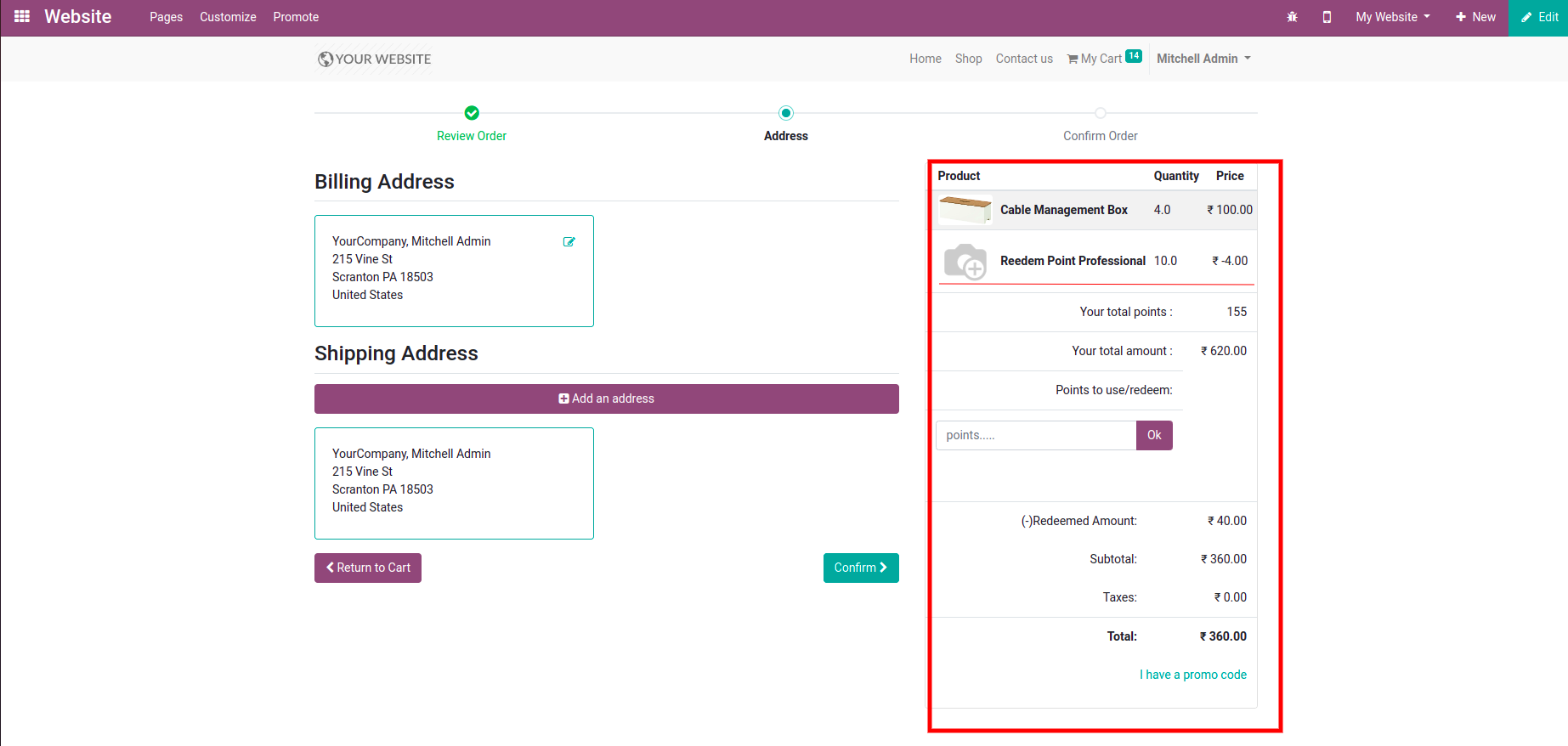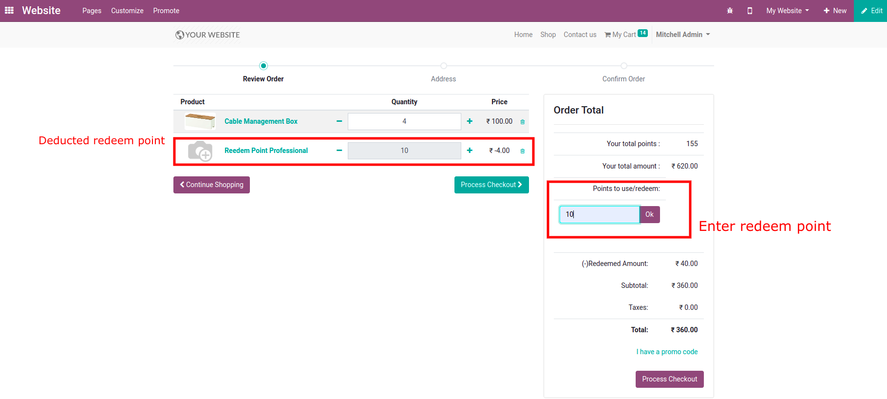 14. Redeem points count and subtracted value shown on the page. Then validate payment.