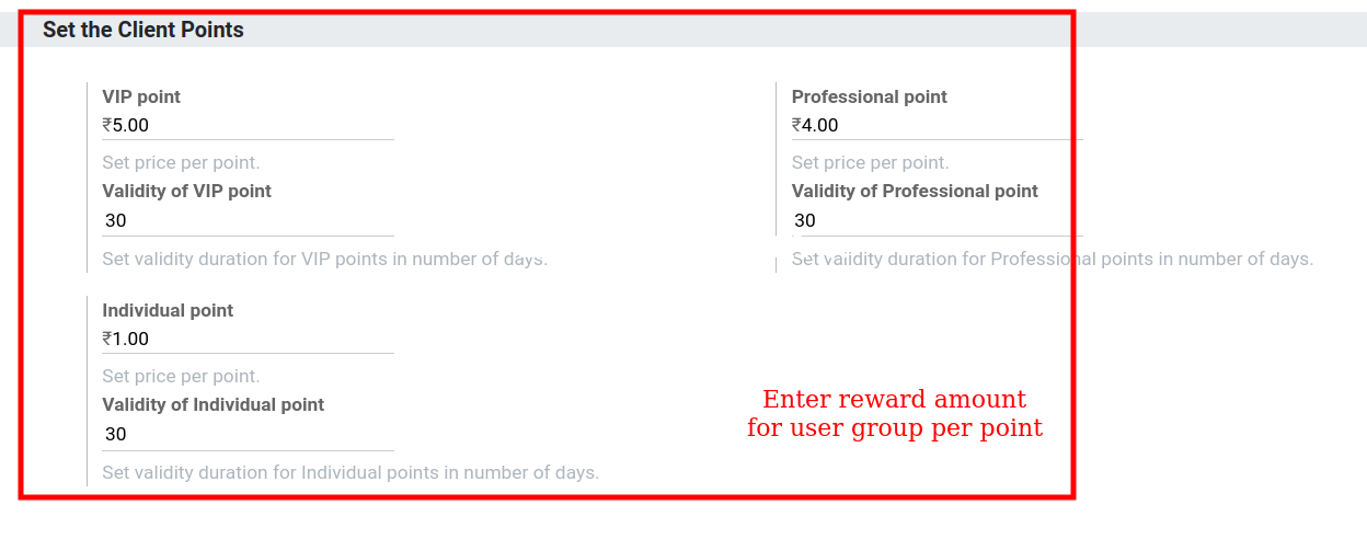 Validity of individual point:– This field gives validity period i.e., Number of days the points are valid for Professional category customers. In this case validity of points to redeem is 30 days which means that after 30 days they will be invalid or cannot be redeemed.