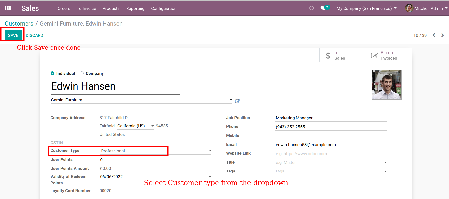 1. Assigning customer type to customer — Go to ->Sales Module ->Order Menu ->Customer sub menu ->Click on a contact->Edit and select the customer type. Customer Type: -It is one of the categories defined for customers, customers are segregated based on this category. Here we can assign a category to customer.
