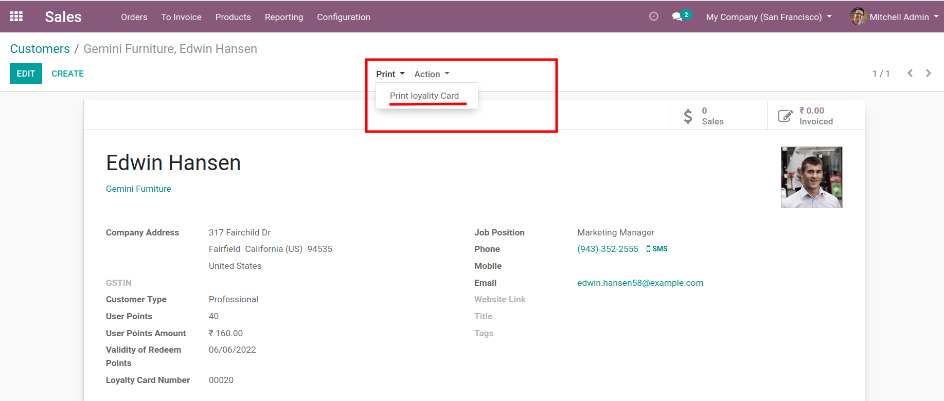 3. Print Sales Card: – Once Save is clicked-> print option gets visible-> On clicking print->print loyalty point option appears.