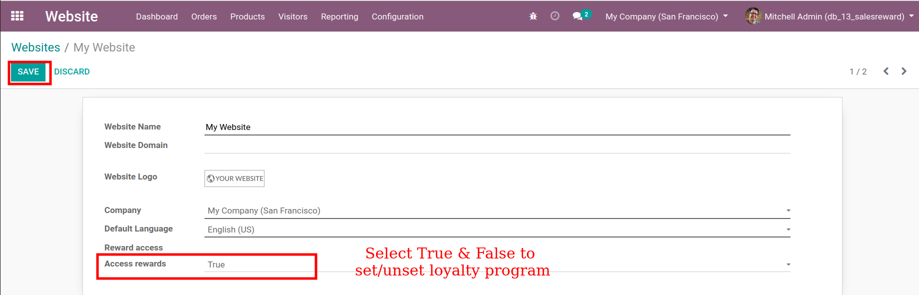 5. Set/Unset loyalty program for website:- Goto Website->Configuration Menu->Websites Submenu->Click on My Website->Edit->Select True or False value for access rewards.