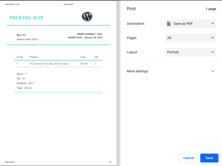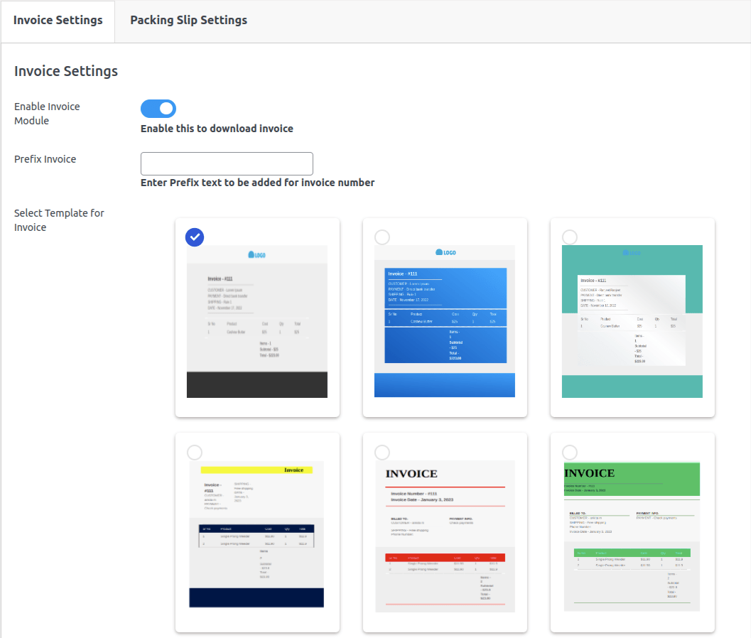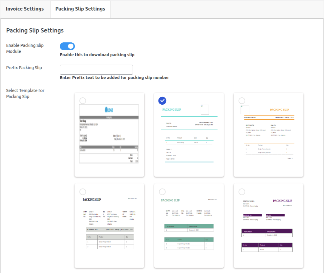 Enable Packing Slip Module – When you enable this, the Packing Slip button appears on the order edit page and the user is able to download the Packing Slip.