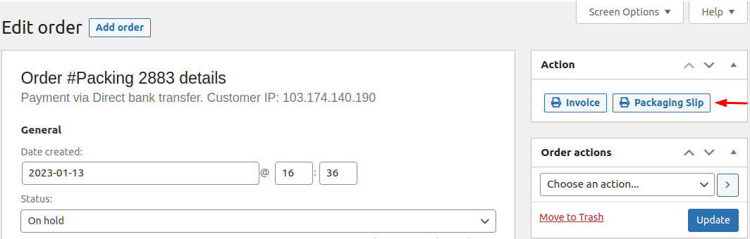 Go to the order editing page > Edit order > click on the packing slip; your packing slip will then be downloaded with the data.