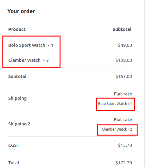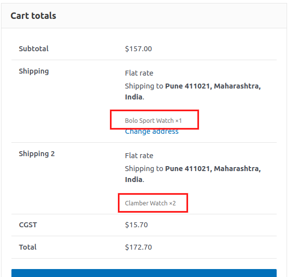 - On the front end, the user has added two product that falls under the above-created criteria for the Packaging rule.