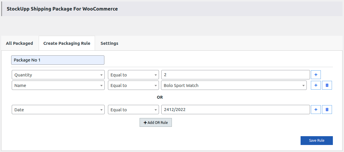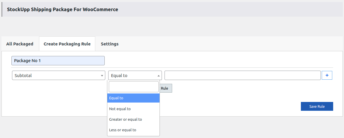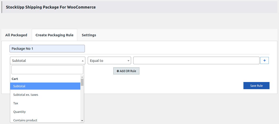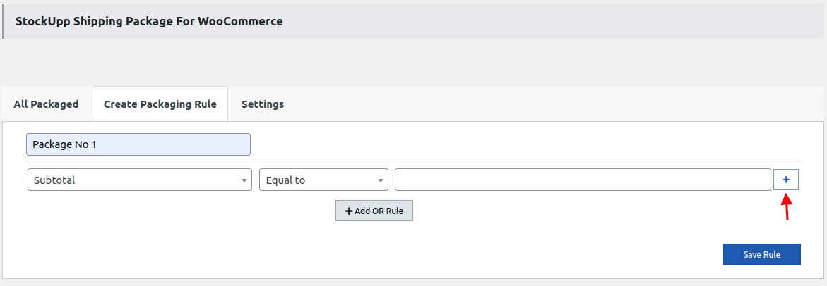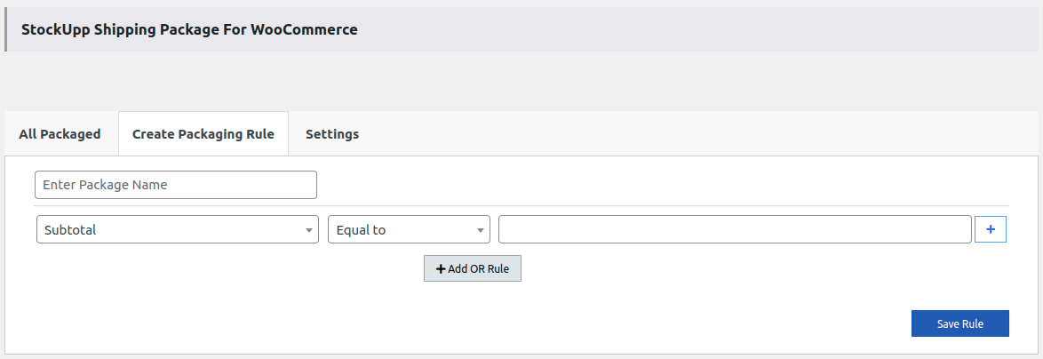- We can split the package based on rules. To set the rules. Click on StockUpp Shipping Package For WooCommerce. Click on Create packaging rule.