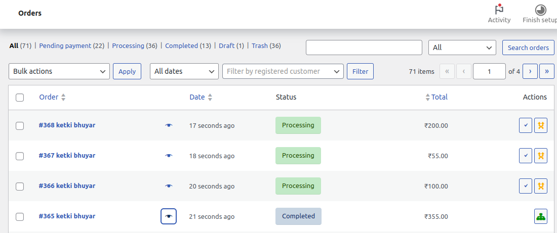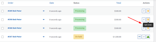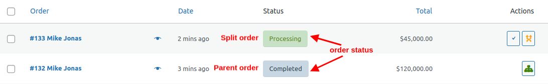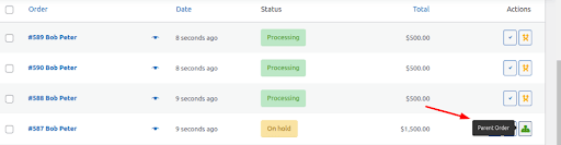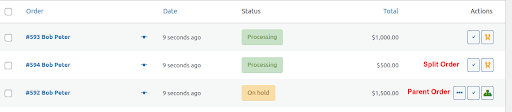 Note: From Screen Options Make sure that “Actions” option is enabled to see green and orange symbols for parent and split order.