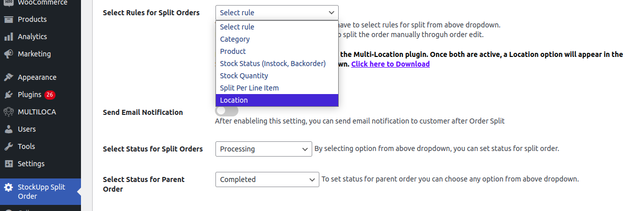 - Location: If you select a “location” rule then the order can be split based on Location wise. first Priority for location rule is that need to activate the “Multilocation Plugin”. After selecting the rule “location” you can see the below screen.