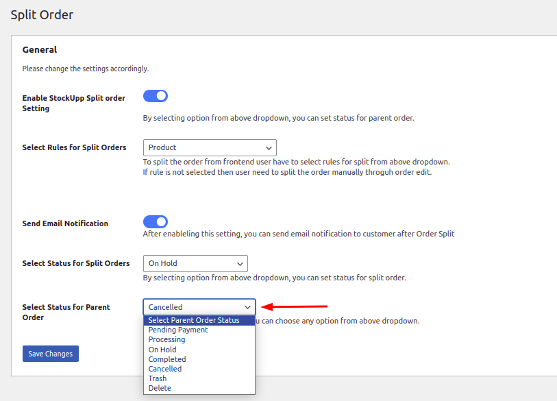 6. Select status for Parent Orders: Choose an order status for the parent order. The parent order status will be displayed based on your selection.