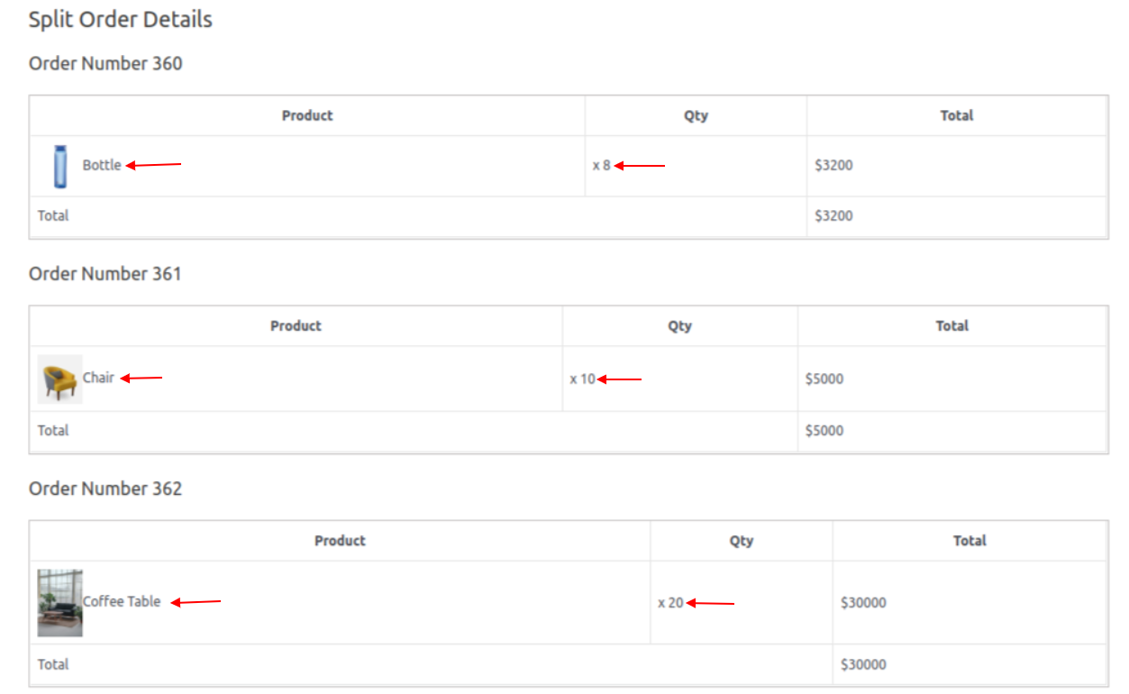 - If a user adds 3 products to the cart then the order will be split 3 times with the name of that product.