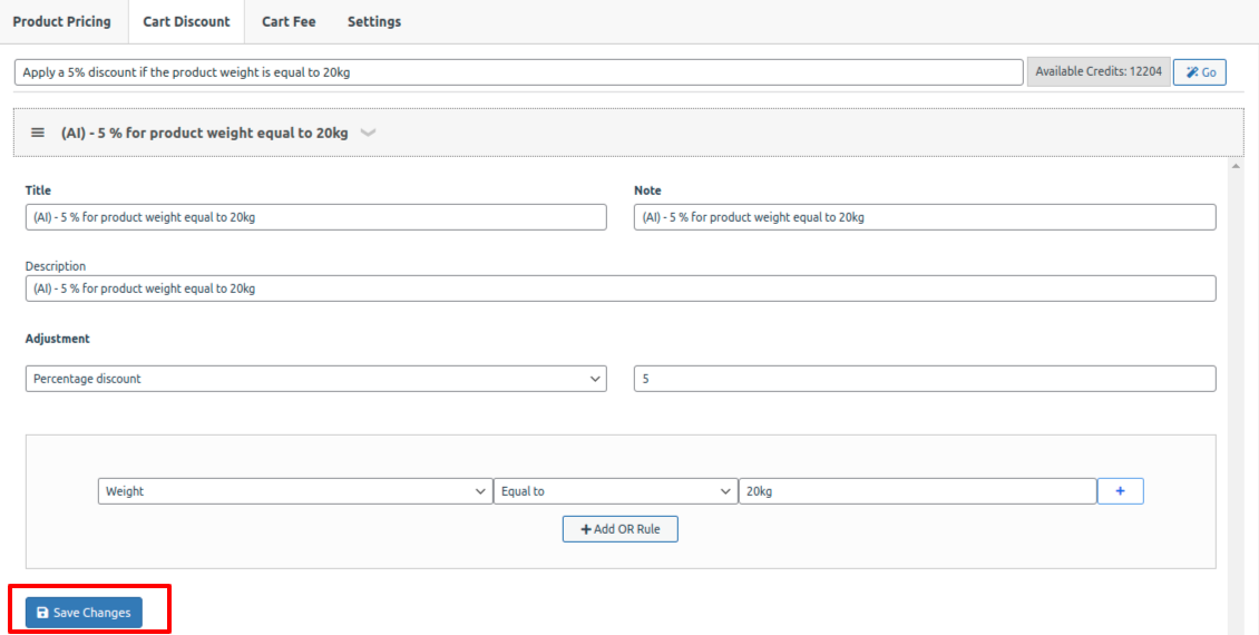 4. Apply a 5% discount if the product weight is equal to 20kg.